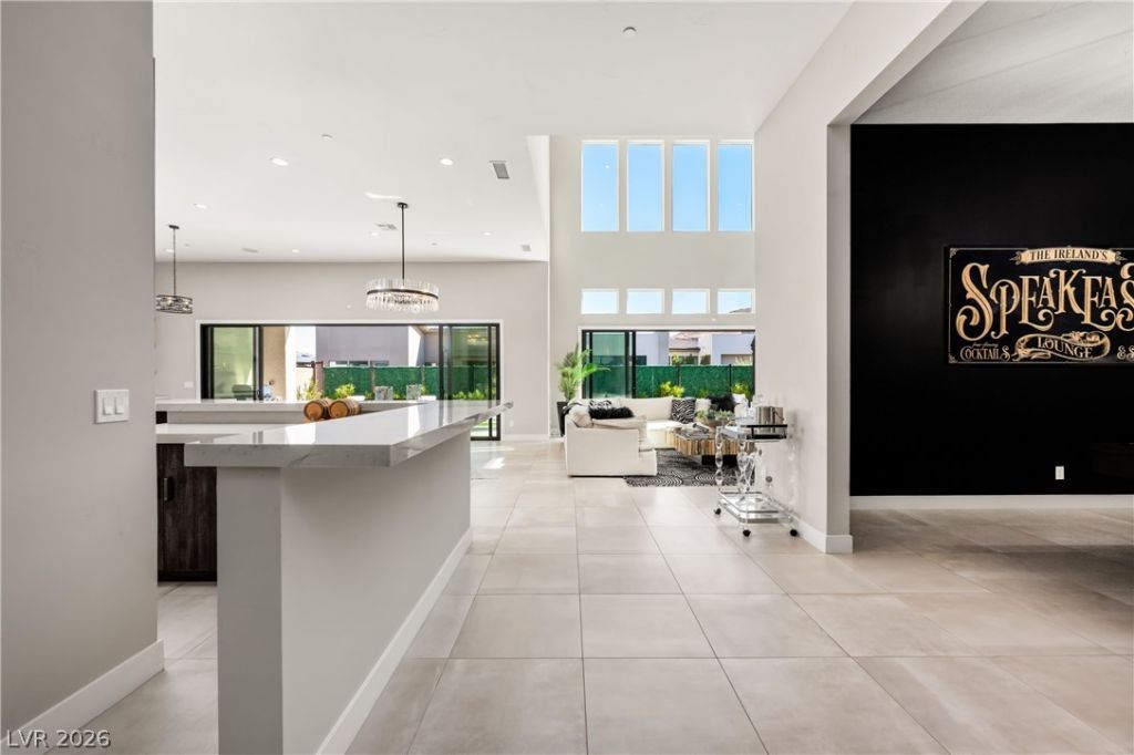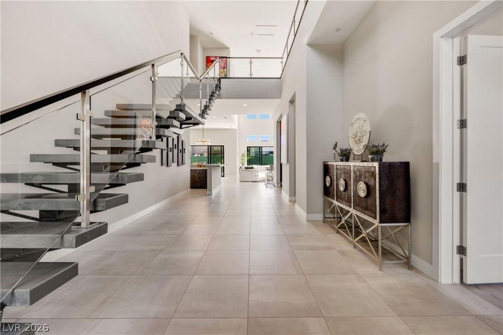 Set within the guard-gated Mesa Ridge community in Summerlin South, this Toll Brothers Willow floor plan blends modern design with timeless warmth. A dramatic 24' entry opens to a grand great room with soaring ceilings and a floor-to-ceiling tile fireplace, complemented by designer lighting and organic-toned tile flooring throughout. The kitchen features Wolf and Sub-Zero appliances, open shelving, and seamless flow into the main living areas?ideal for everyday living and entertaining?alongside a wet bar and statement floating staircase. All four bedrooms are ensuite, including a spacious primary suite with a spa-like bath, dual water closets, and an oversized walk-in closet. Sliding doors create effortless indoor-outdoor living, opening to a private backyard with a pool, multiple lounge areas, and beautiful mesa views.